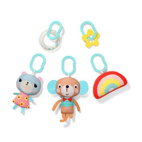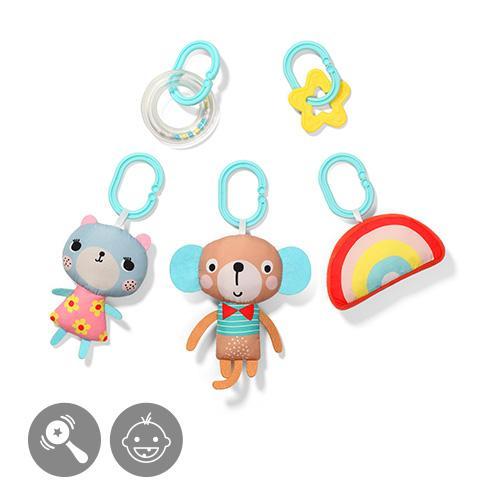 Коврик имеет 5 различных подвесок для поддержки развития малыша, включая 2 погремушки, шуршалку, пищалку и прорезыватель. Вы можете прикрепить игрушки к аркам по своему усмотрению. Они помогут вашему ребенку упражнять руки - хватать и переставлять предметы.